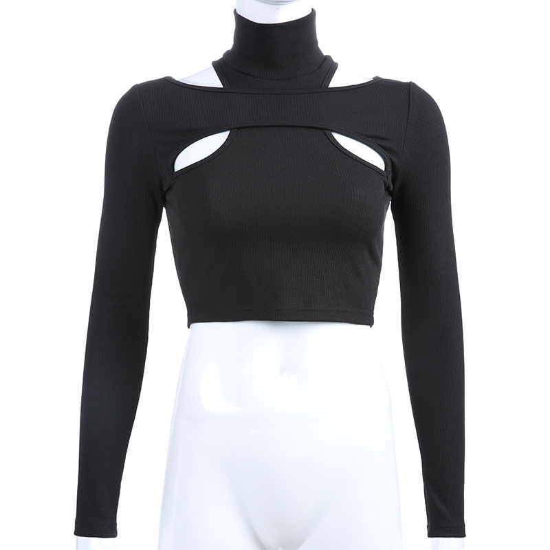 タートルネックと長袖で上品さを保ちながら、斜めに配された個性的な開口部がモダンな印象を演出します。