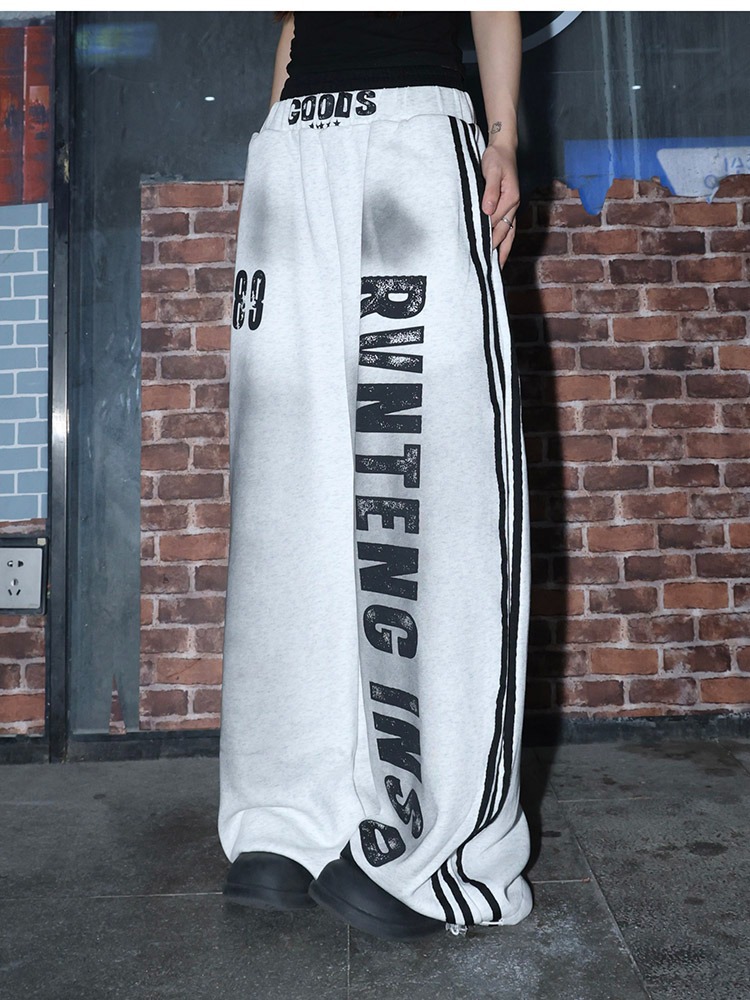 ストリート感溢れる大胆な英字ロゴと縦ラインが印象的なダンス衣装向けのワイドパンツです。