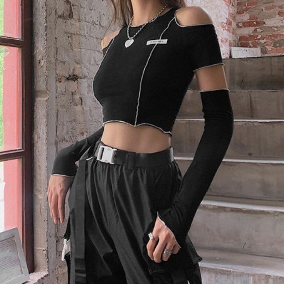 肩を大胆に開けたデザインが特徴的なダンス衣装向けトップスです。
