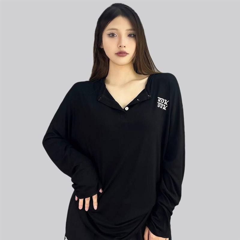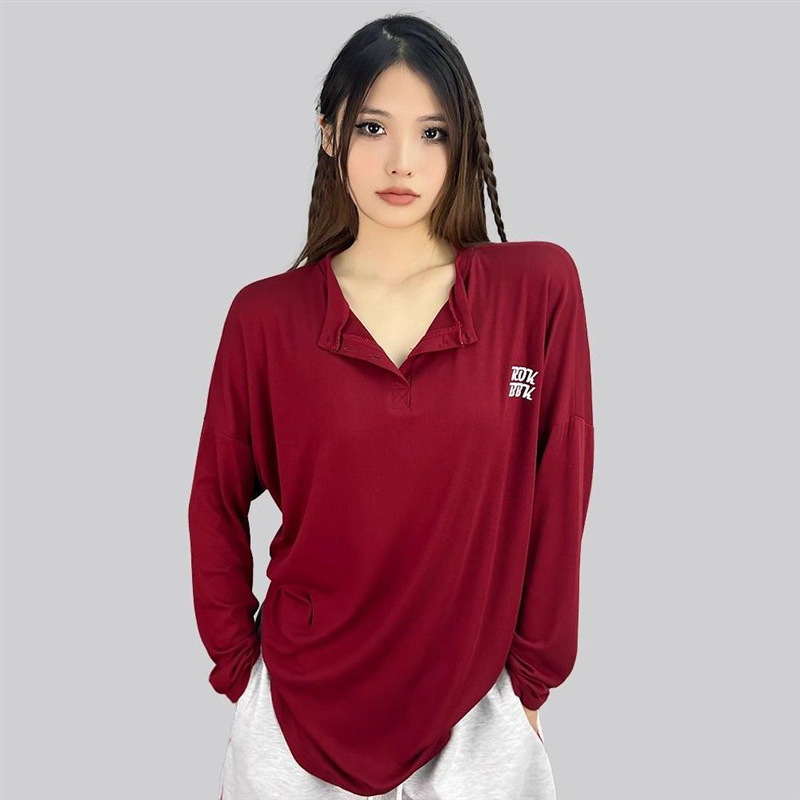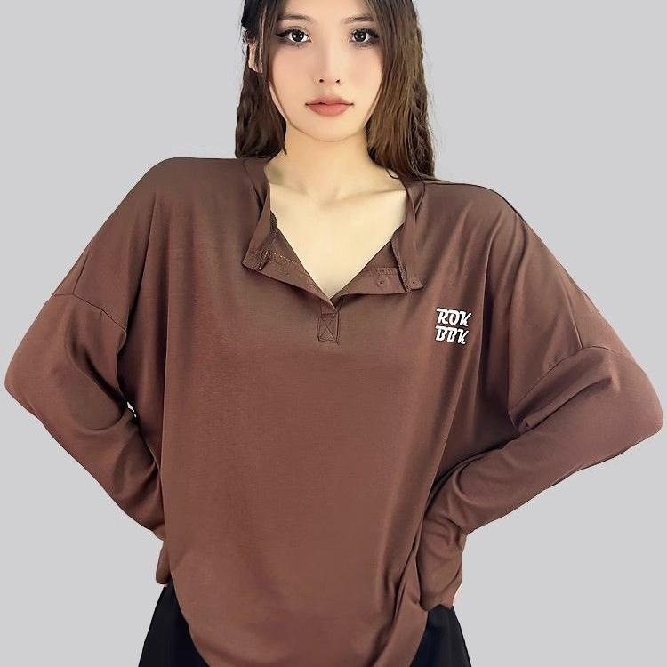 襟元のデザインがアクセントになったゆったりシルエットのダンス衣装トップスです。