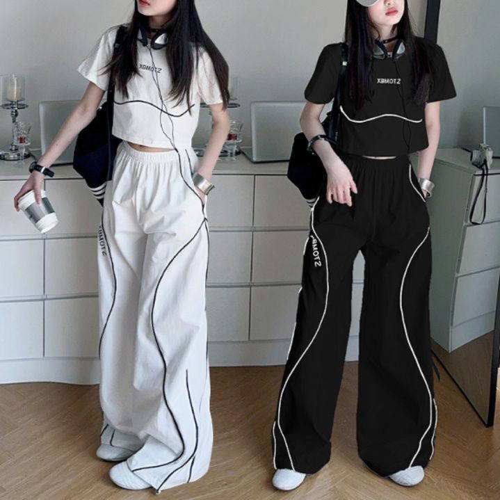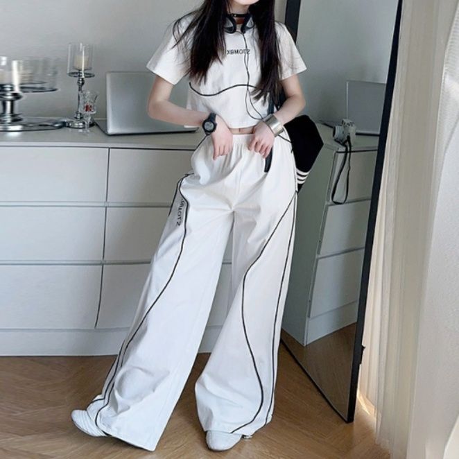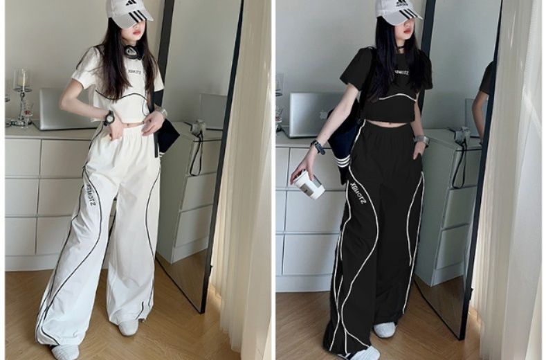 短丈トップスとワイドパンツの組み合わせで、動きやすさと洗練されたスタイルを両立しました。