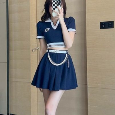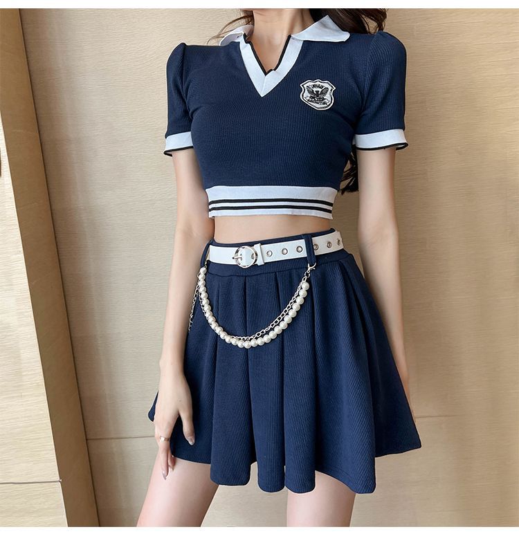 トップスは配色襟とラインがアクセントになった丈短めのデザインで、胸元にワンポイント刺繍が施されています。