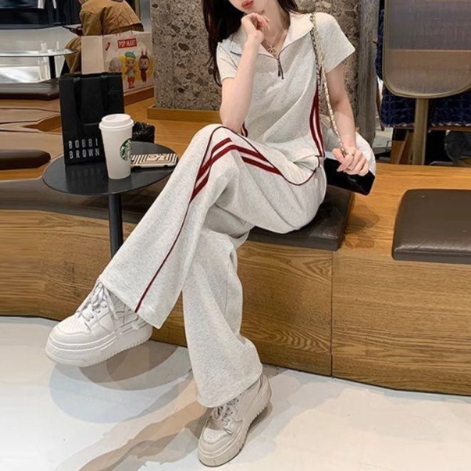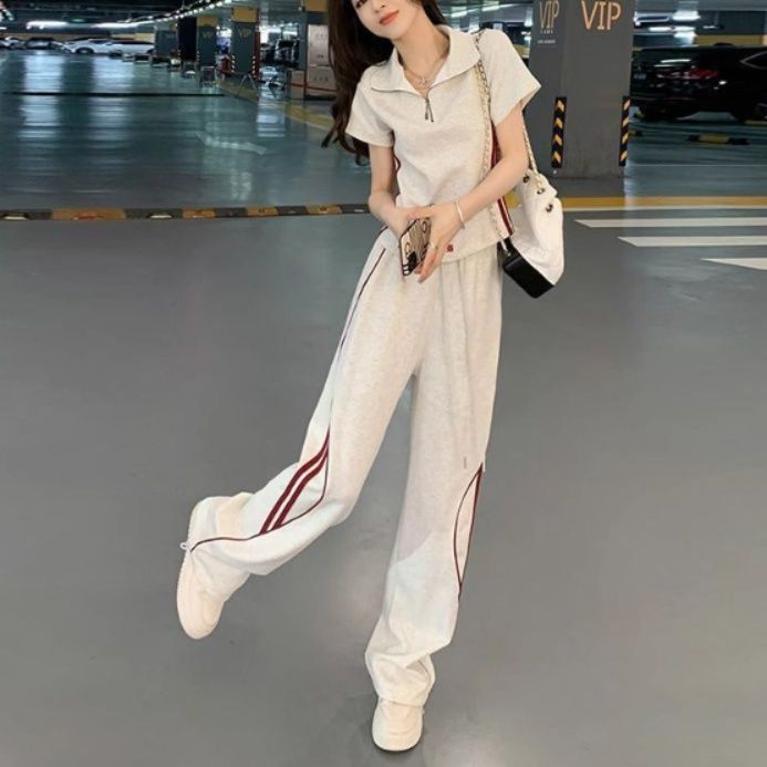 襟付きの半袖トップスはジップデザインで動きやすく、サイドラインがアクセントのワイドパンツとの組み合わせがおしゃれです。