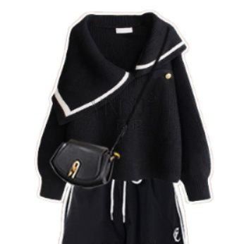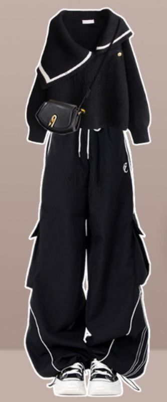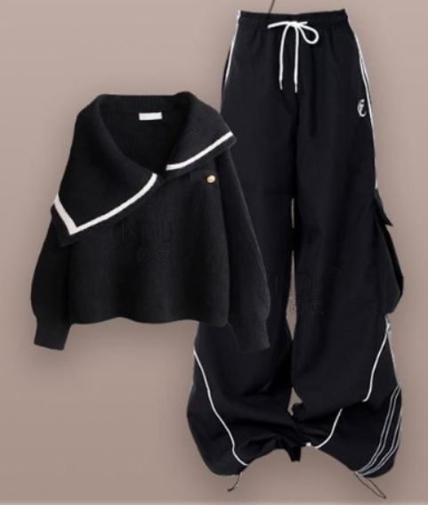 個性的な非対称襟のデザインが目を引くニットトップスとワイドパンツのダンス衣装セットアップです。