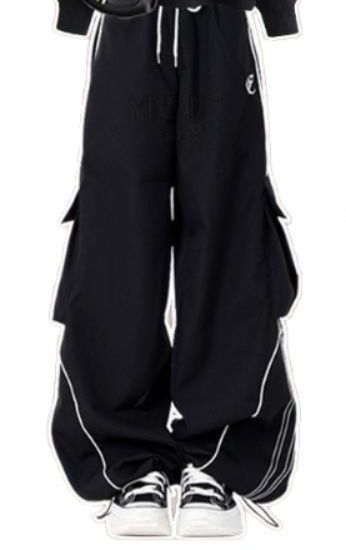 パンツは裾に向かって広がるワイドシルエットで、立体的なギャザーデザインがアクセントになっています。