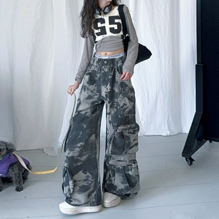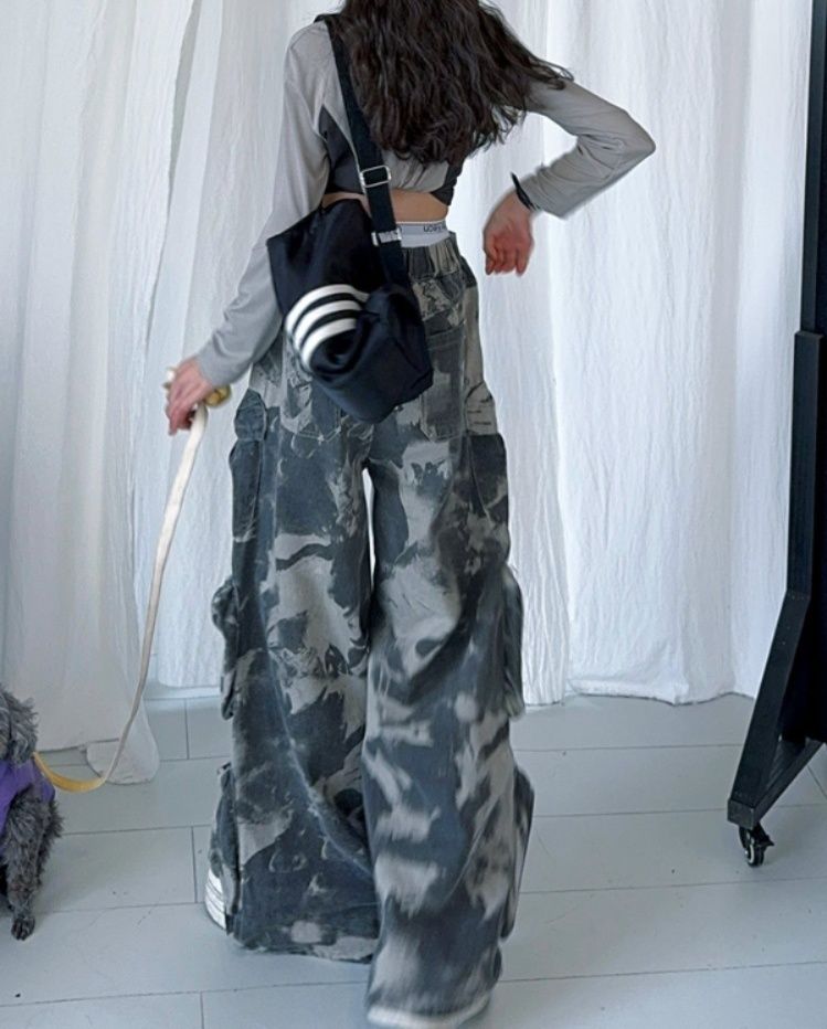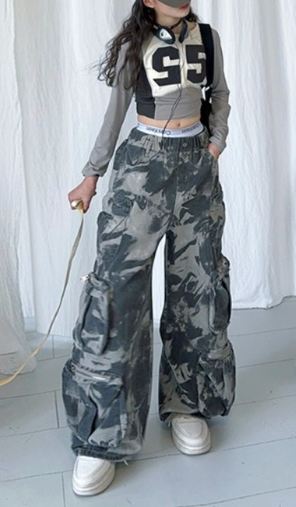 大胆な数字ロゴが際立つショート丈フーディーと、迷彩柄のワイドパンツを組み合わせた個性的なデザインが魅力です。