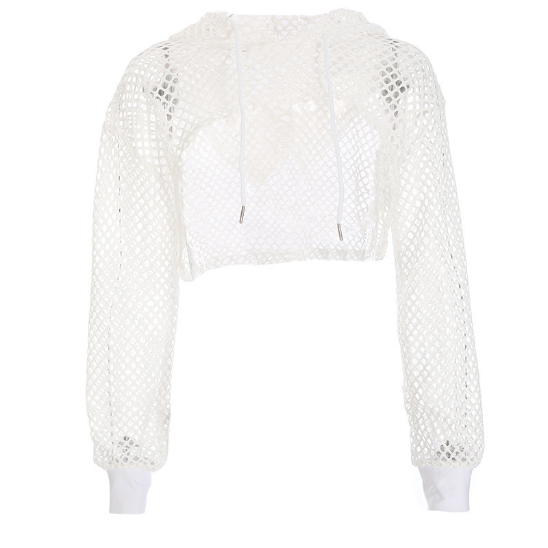 ショート丈のクロップドシルエットが体のラインを美しく見せ、フード付きでカジュアルながらもスタイリッシュな印象を演出します。