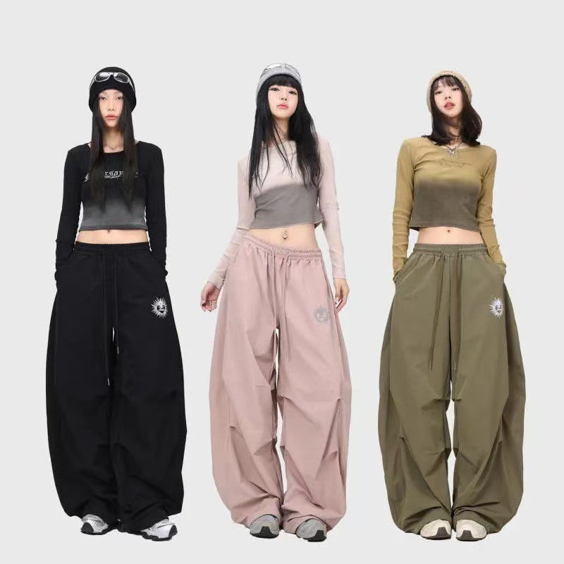 太陽モチーフの刺繍がアクセントになっており、ストリート系からヒップホップまで幅広いダンスシーンに対応します。