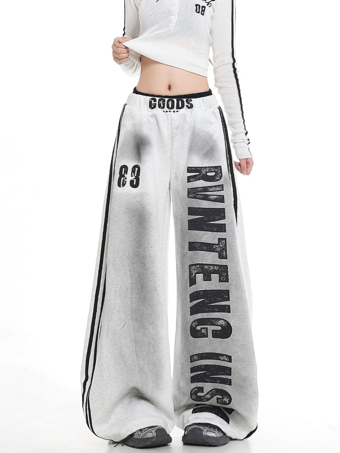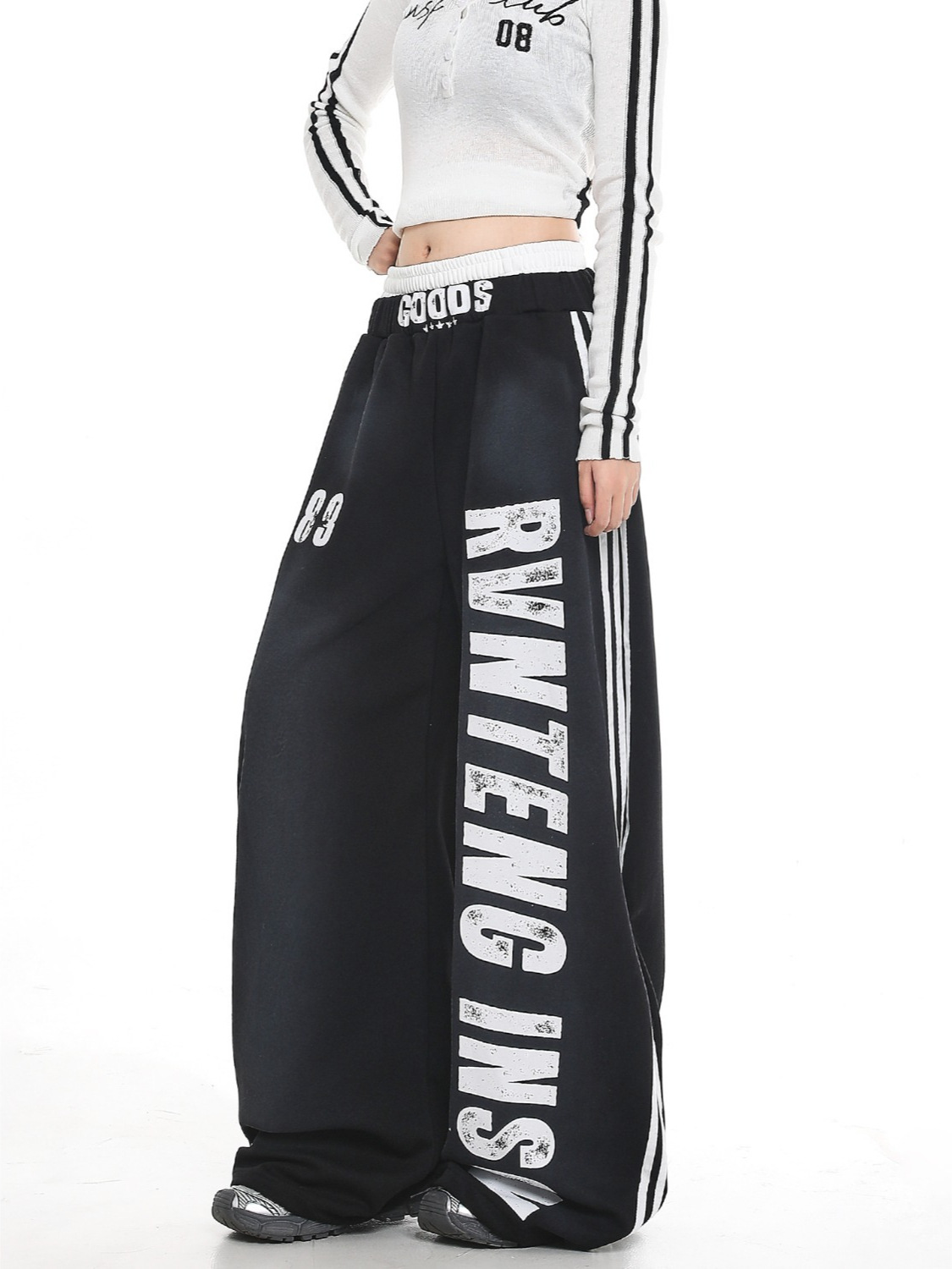 ウエストバンドのロゴデザインや数字プリントがアクセントとなり、ヒップホップやストリートダンスに最適です。