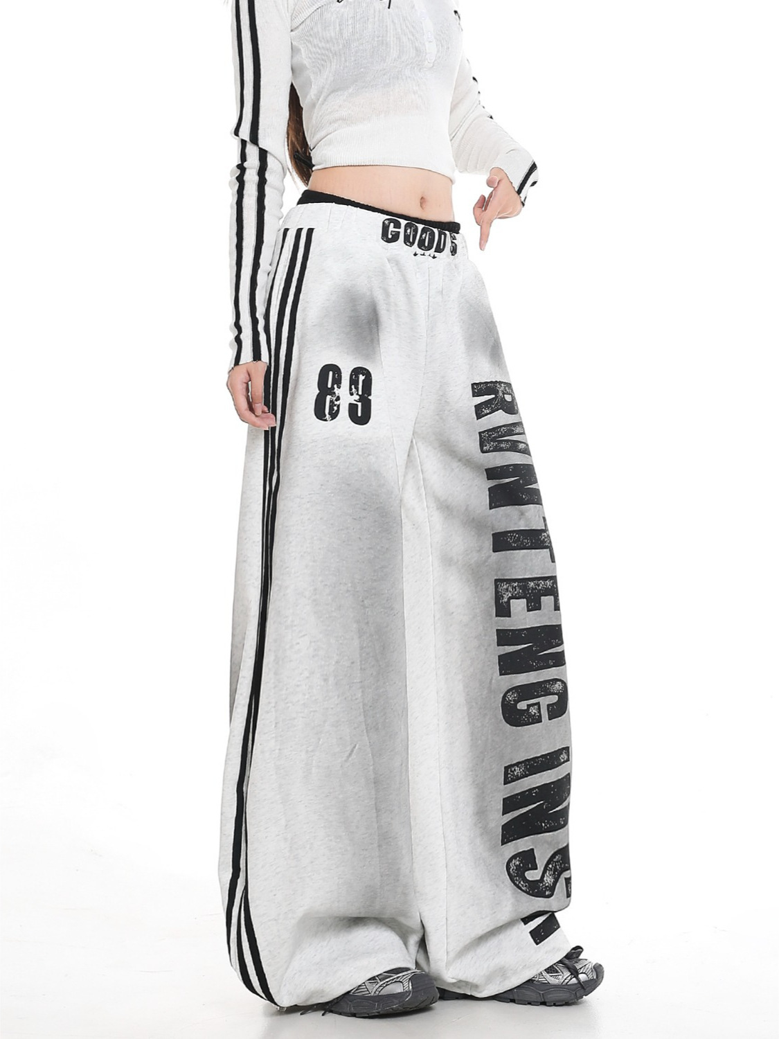 ゆったりとした超ワイドシルエットが動きやすさを実現し、サイドの二本ラインがスポーティな雰囲気を演出します。