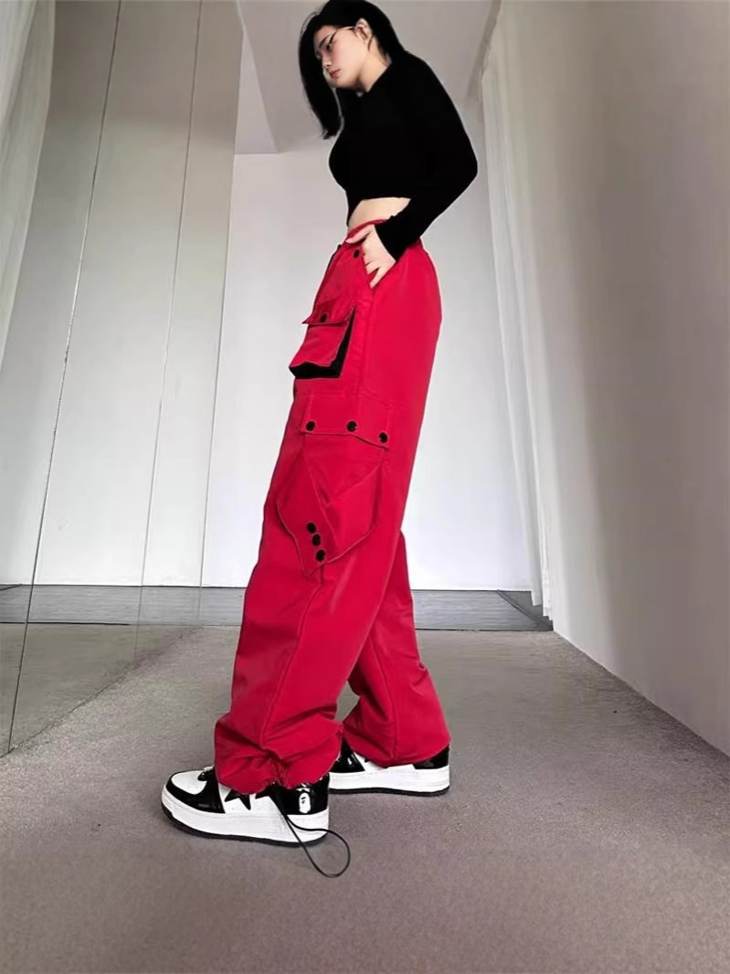 両サイドに配置された大きめのカーゴポケットとボタンディテールが機能性とファッション性を両立させています。